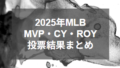 2025年シーズン【2025年MLB】シーズンMVP投票結果まとめ!サイヤング賞・新人王投票の結果も紹介!選出方法や歴代受賞者についても解説! 2025年シーズンにおけるシーズンMVP・サイヤング賞・新人王の投票結果をまとめました。大谷選手が歴代単独2位となる3年連続・通算4度目のMVP受賞となりました。 2025.11.112025年シーズン