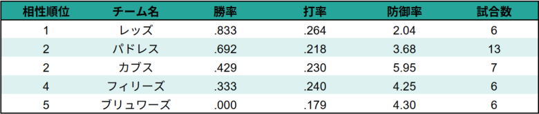 レッズ打線に対する投手陣の相性が良いです