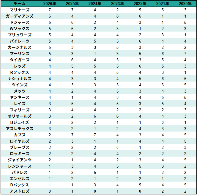 球団別のプロスペクト保有数も紹介します