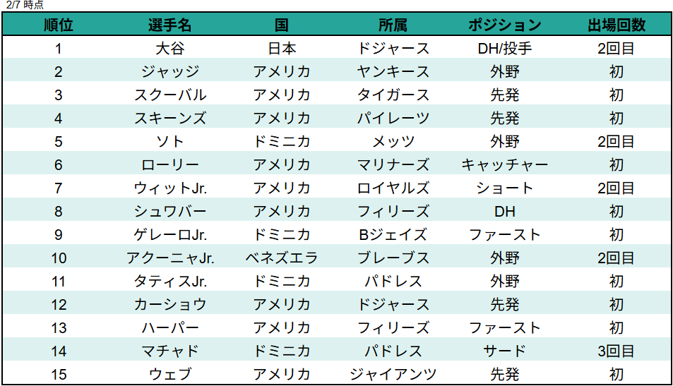 - 1.1 1位 大谷翔平(日本)