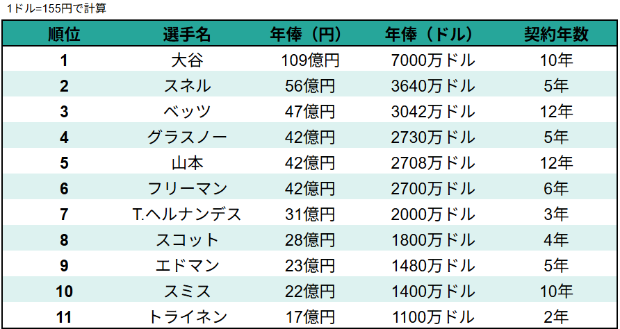 なおMLBの歴代契約金ランキングについては